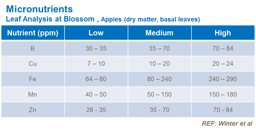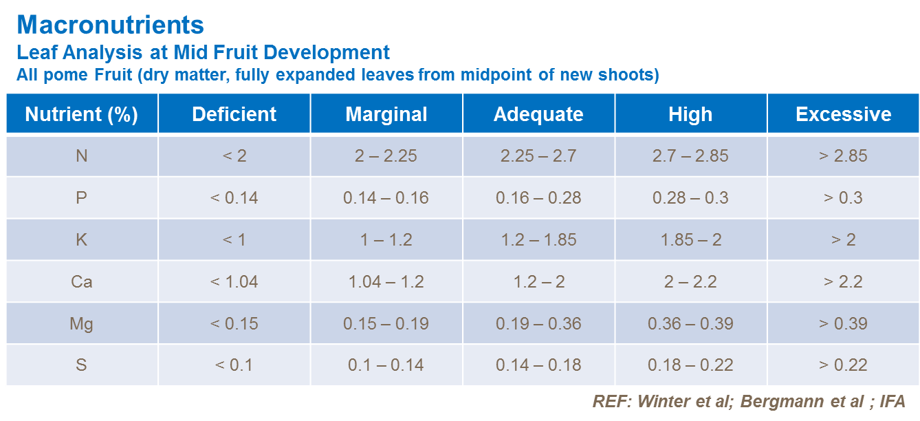 While the tables are accepted values for optimum growth, they do not take into account the ability of the tree to recycle nutrients to the fruit. For example, even if tissue levels of Ca are sufficient, the fruit may be deficient and suffer from storage quality problems. Analysis of the fruitlet at around 25-30 mm diameter, is increasingly being used to predict nutrient imbalances, which may cause storage problems. This enables correct targeting of fruit or foliar sprays where required.