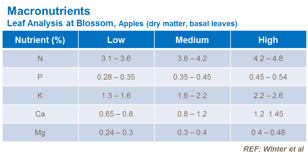 As a consequence of these seasonal variations, sampling is normally carried out at standard times. Traditionally this is at 110-125 days post full bloom, during the middle of the growing season. However, deficiencies may already be restricting growth, yield and quality potential by this stage. Thus, analyses at the blossom stage of growth are increasingly being carried out in order to correct nutrient disorders before they arise.