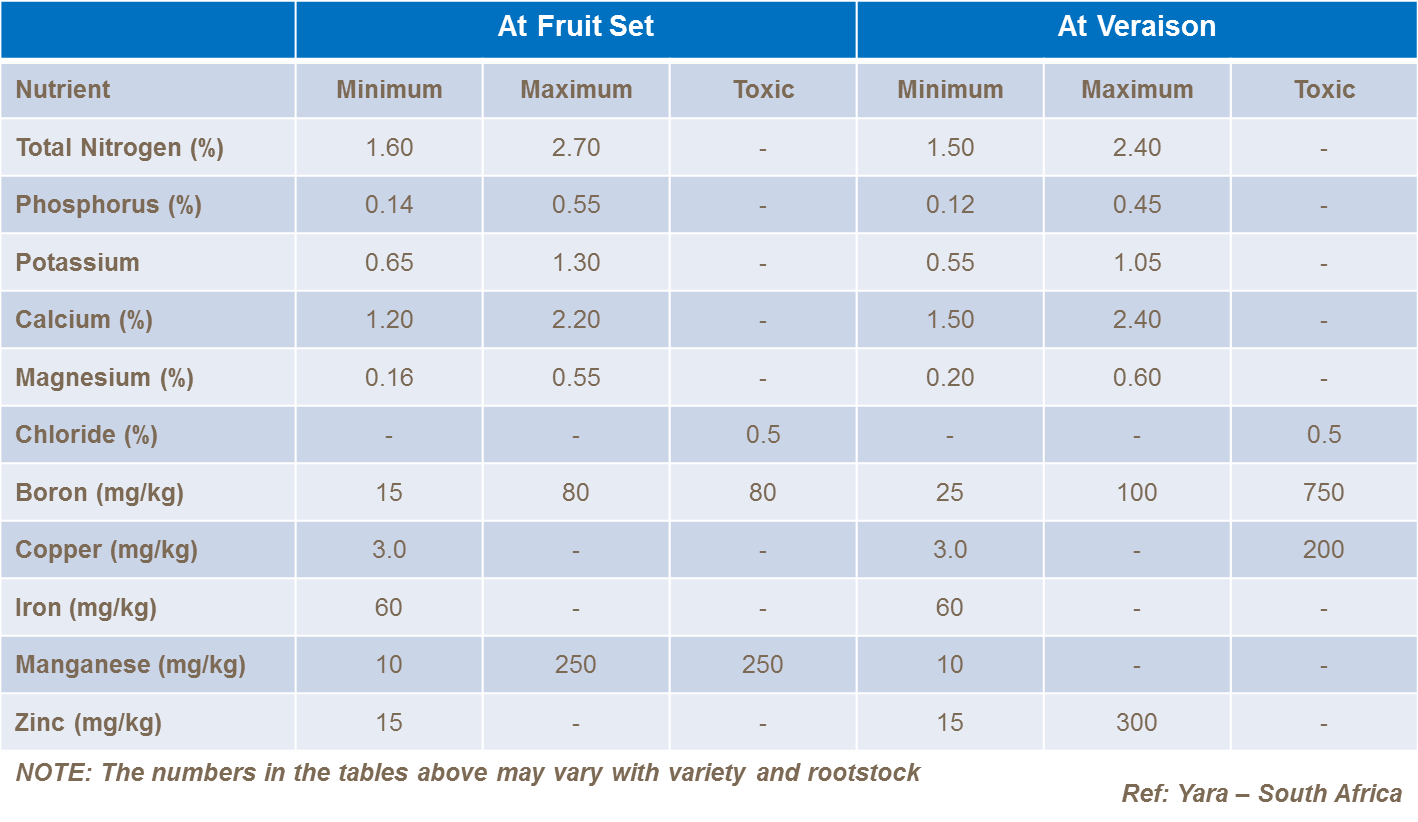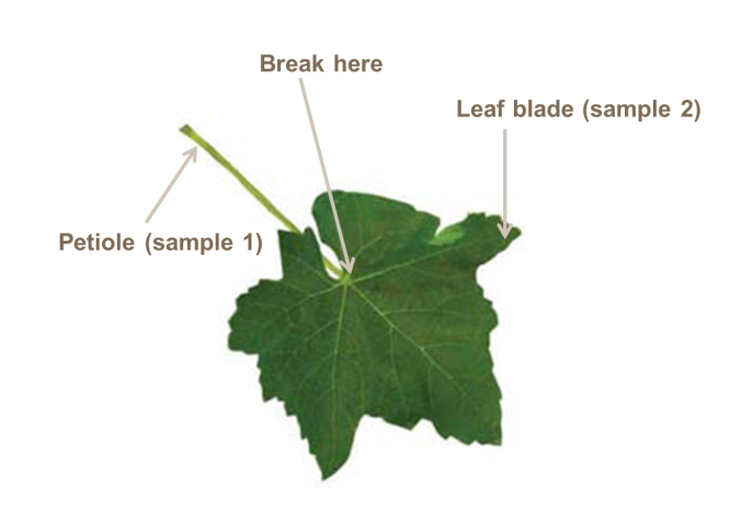 Various countries use either the whole leaf (French Method) the petiole on its own (Californian Method), or just the leaf blade (South African Method), to check for nutrient status. Most common practice is to test at veraison or the end of flowering.