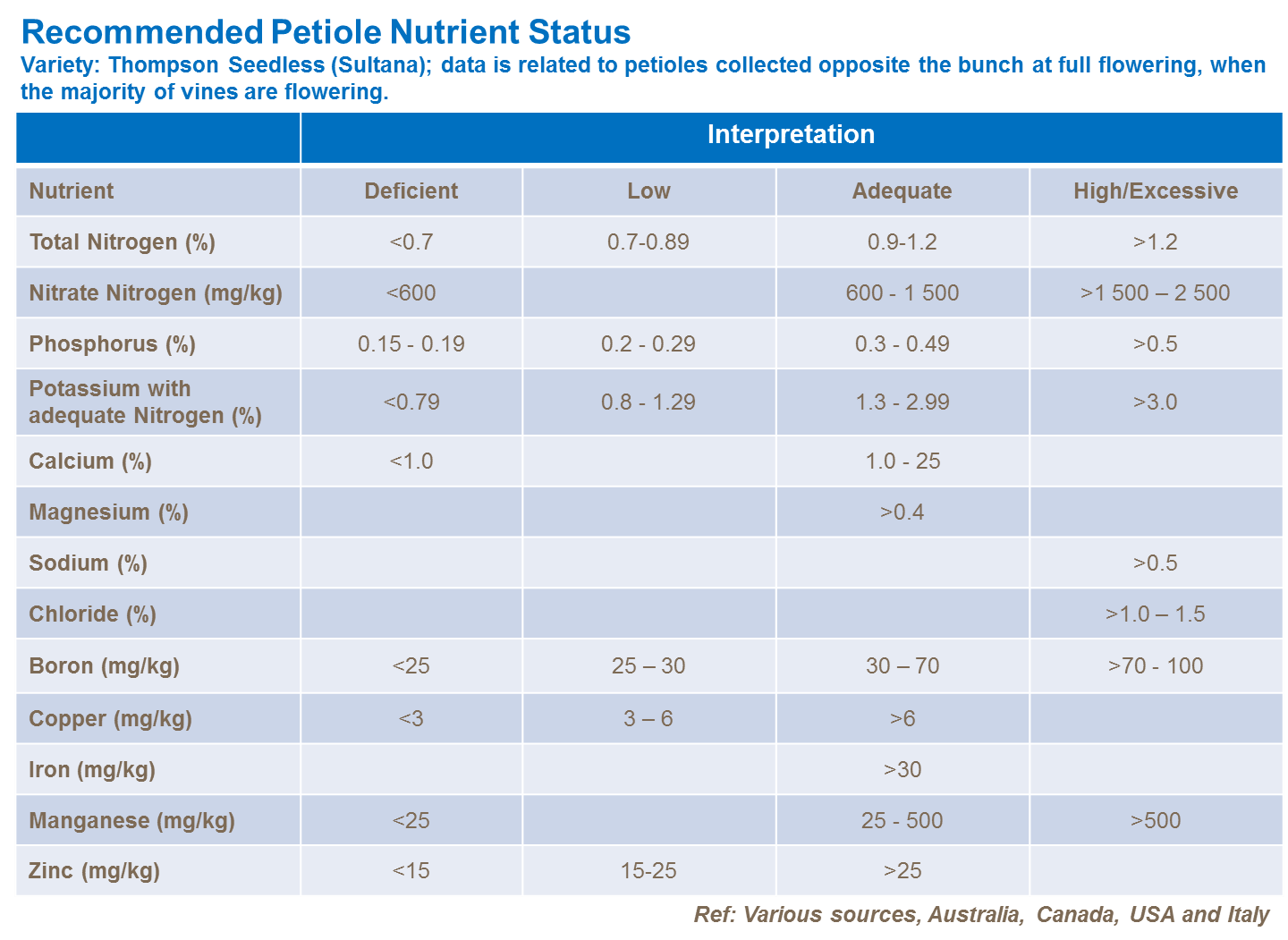 Plant analysis provides a more accurate, immediate assessment of the nutrient status of the vine (Table 6). It will also confirm hidden deficiencies where plant symptoms have yet to be seen and accurately identify the balance between needed elements.
