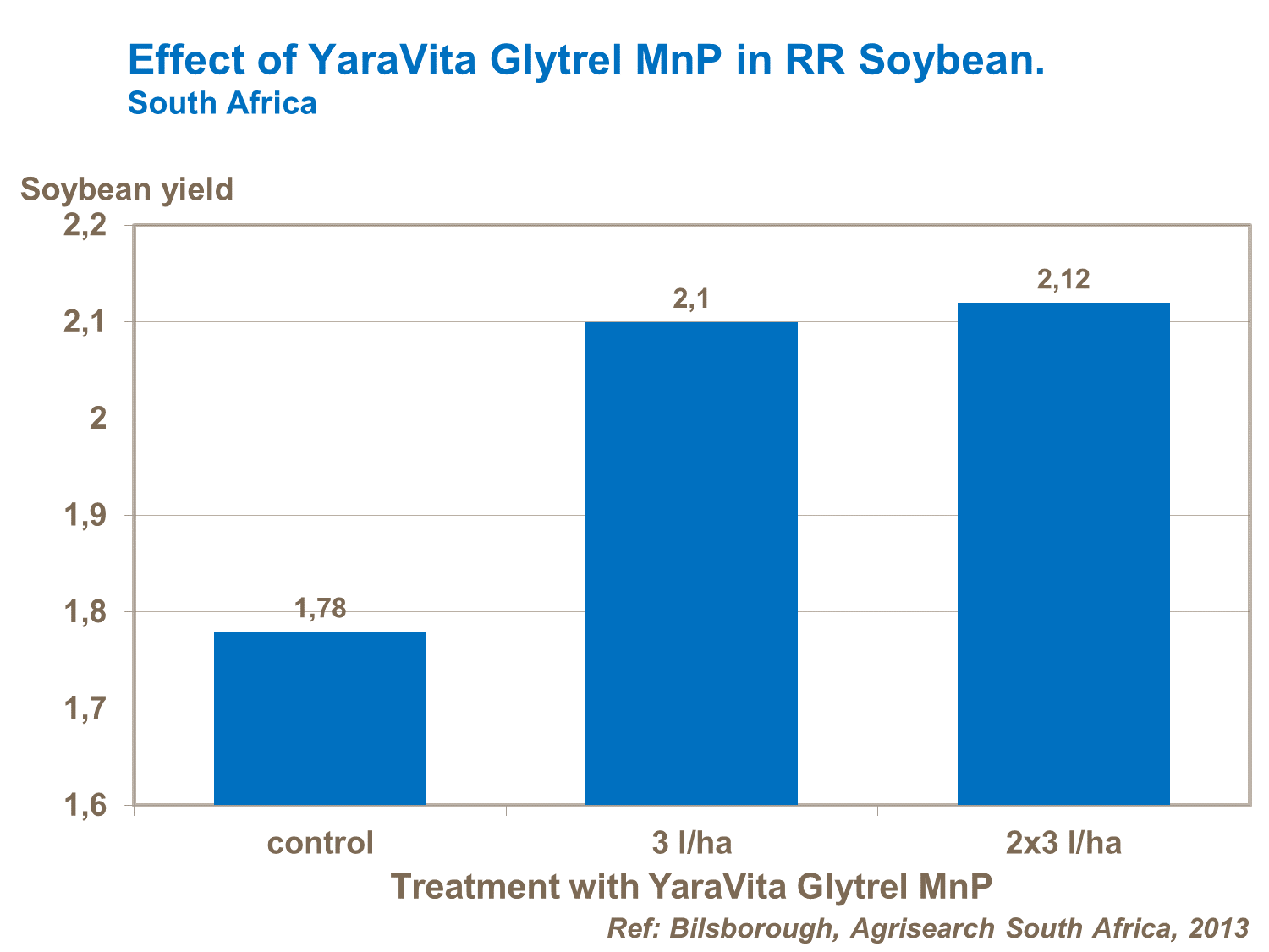 L’application de 3 l/ha de YaraVita Glytrel MnP mélangé en cuve avec du glyphosate a permis d’augmenter le rendement des semences de 18 % comparativement au groupe témoin non traité. Deux applications de 3 l/ha YaraVita Glytrel MnP, la première mélangée en cuve avec le glyphosate et la deuxième appliquée 14 jours plus tard ont donné une augmentation de 19,1 % du rendement des graines par rapport au groupe témoin. Le YaraVita Glytrel MnP appliqué comme mélange en cuve était sans danger pour la récolte et n’a pas affecté la capacité du glyphosate à contrôler les mauvaises herbes sur le site.