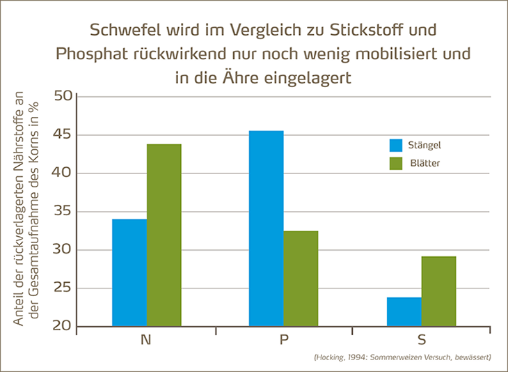 Im Vergleich zu anderen Nährstoffen wird Schwefel innerhalb der Getreidepflanze kaum verlagert (siehe Abbildung). Daher entwickeln die Pflanzen in späten Wachstumsstadien oftmals Nährstoffmängel. Dieses Problem verschärft sich, wenn trockene Bedingungen hinzukommen. Eine Blattdüngung mit Sulfat-Schwefel und Stickstoff kann hier Abhilfe schaffen. Die Pflanzen können die Nährstoffe in dieser Form direkt über das Blatt aufnehmen. So werden die oberen Pflanzenteile optimal versorgt und die Bildung der Ähren sowie die spätere Kornfüllung verbessert.