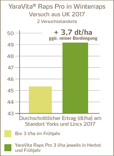 wurden höhere Erträge erzielt als mit einer reinen Bordüngung. Damit ist offensichtlich, dass außer Bor oftmals auch andere Mikronährstoffe, wie zum Beispiel Mangan und Molybdän fehlen. Aus diesem Grund sollten Sie YaraVita Raps Pro einsetzen. Der Blattdünger liefert den Pflanzen genau die Kombination an Mikronährstoffen, die sie im Herbst brauchen.