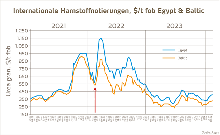 Wer zurzeit noch auf nachgebende Preise hofft, dem sollte bewusst sein, dass sich die Preise bereits auf einem recht niedrigen Niveau befinden – im Vergleich zu den vergangenen zwei Jahren. International gesehen scheinen die Preise vorerst ihren Tiefpunkt erreicht zu haben. Daher ist mit einer nennenswerten Korrektur bis zum Frühsommer nicht zu rechnen. Plötzliche Preisschwankungen lassen sich allerdings für den Düngermarkt nie ausschließen, da es sich hierbei um einen Weltmarkt handelt.