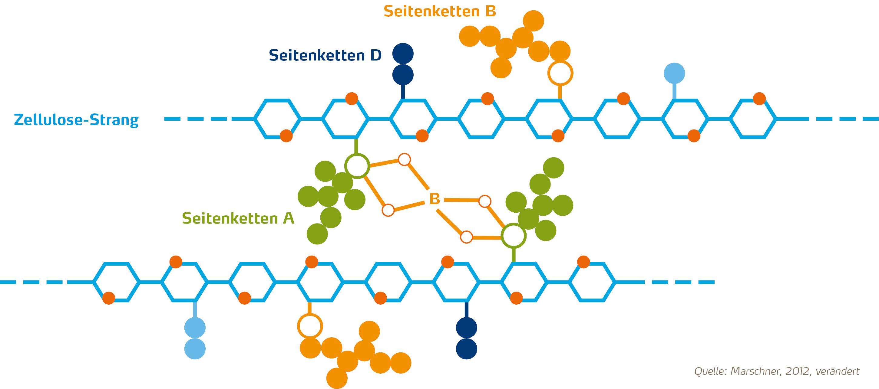 Bor ist wichtig für die Zuckerrübenpflanze, damit sie das Meristemgewebe in den Herzblättern vernünftig entwickeln kann. In Zellwänden dient es als Strukturfestiger, indem es längere Cellulose-Ketten miteinander verbindet und so der Pflanze Stabilität bringt (siehe Abbildung).
