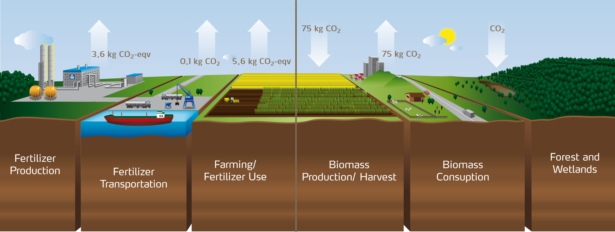 Pflanzen nehmen während ihres Wachstums große Mengen CO2 auf. Eine optimierte Düngung kann die Biomasseproduktion und somit die CO2-Aufnahme im Vergleich zu Feldern, die lange nicht gedüngt wurden, um das 4-5fache steigern. Beispielsweise bindet ein mit 170 kg N / ha erzielter Getreideertrag von8 t / ha eine CO2-Menge von 12800 kg / ha. Das entspricht einer Bindung von 75 kg CO2 pro kg ausgebrachtem N.