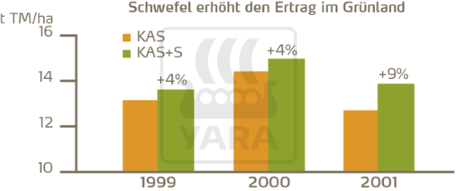 Schwefel dient in erster Linie zur Bildung von Protein. Schwefelmangel verringert die Wirksamkeit von Stickstoff und verringert dadurch den Ertrag. In der Vergangenheit wurde der Schwefelbedarf durch Einträge aus der Atmosphäre gewährleistet. Heute erfordern eine sauberere Luft und höhere Ertragserwartungen eine ausreichende Schwefeldüngung. Der Schwefelentzug kann bis zu 45 kg/ha betragen. Schwefel aus Gülle ist für die Pflanzen nicht sofort verfügbar und kann deshalb nur langfristig berücksichtigt werden.